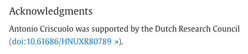 Likewise, a publication by Criscuolo et al in Physics of Life Reviews (a journal published by Elsevier) correctly identified NWO using our Funder ID, but omitted our Grant ID in the metadata, despite its clear inclusion by the author in the acknowledgements (left). Apparently, this persistent link and open metadata is being thrown out of the infrastructure at a crucial time, when the article record could be connecting up with the grant record and making it easy and open for us all to track and report on the connection.