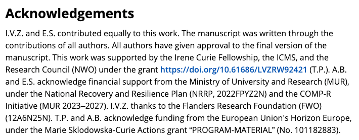 Let’s demonstrate that in an example. On the left, we see the acknowledgements section of a paper by Van Zundert et al. in the journal Small, published by Wiley. The authors acknowledge a host of funding organizations and grants, including NWO with Grant ID https://doi-org.ezproxy.galter.northwestern.edu/10.61686/LVZRW92421. On the right, we see that the publisher has correctly included NWO in the metadata as the funder with our Funder ID, but there’s no reference to our Grant ID, instead mentioning an award number, which seems to refer to a Marie Sklodowska-Curie grant for the same research with their internal award identifier.